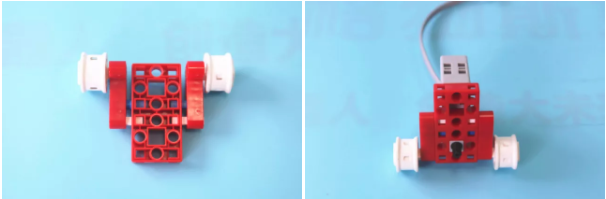 独角要能够旋转离不开电机的作用,电机要固定需要用到小方板。此外考虑到小车要前进,为了简化零部件,这边利用两个D20轮毂来充当小车的两个前轮。