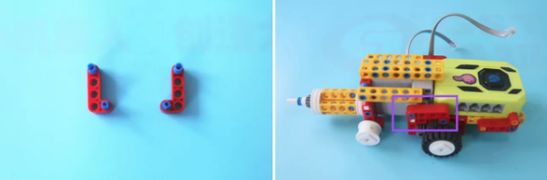 独角鲸小车两个后轮及其动力机构就完成啦。下面将车前轮部分和车后轮部分组合起来,需要运用到如下的结构件进行固定。